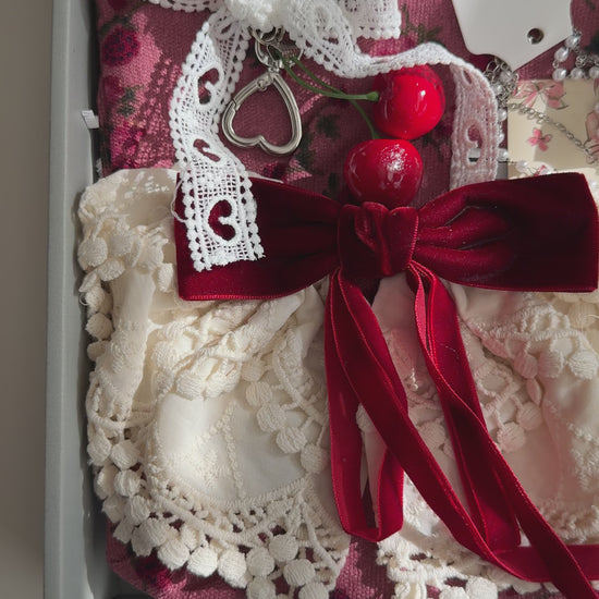 This charming Cherry Aesthetic Gift Box is the perfect mix of soft vintage style, red accents, lace, ribbons, and cute cherry details.